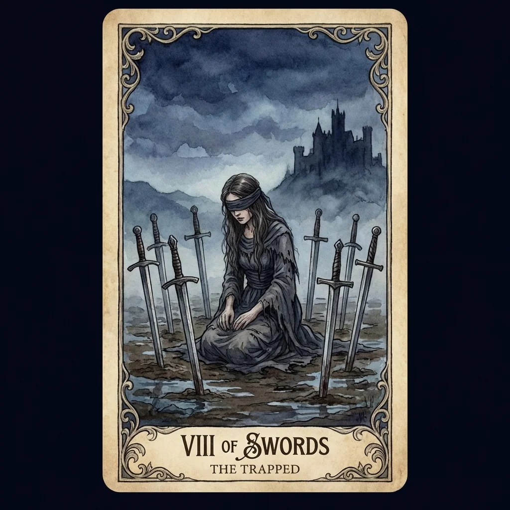 The Eight of Swords shows feeling trapped, restricted, and powerless — but the bonds are often self-imposed. Your limiting beliefs create a prison. The way out exists if you open your eyes.