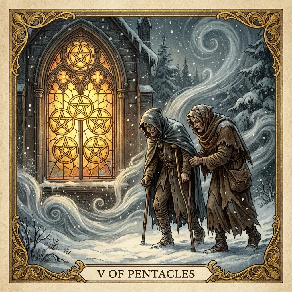 The Five of Pentacles speaks of financial hardship, feeling left out in the cold, and material or spiritual poverty. Help may be available but pride or despair prevents you from seeking it.
