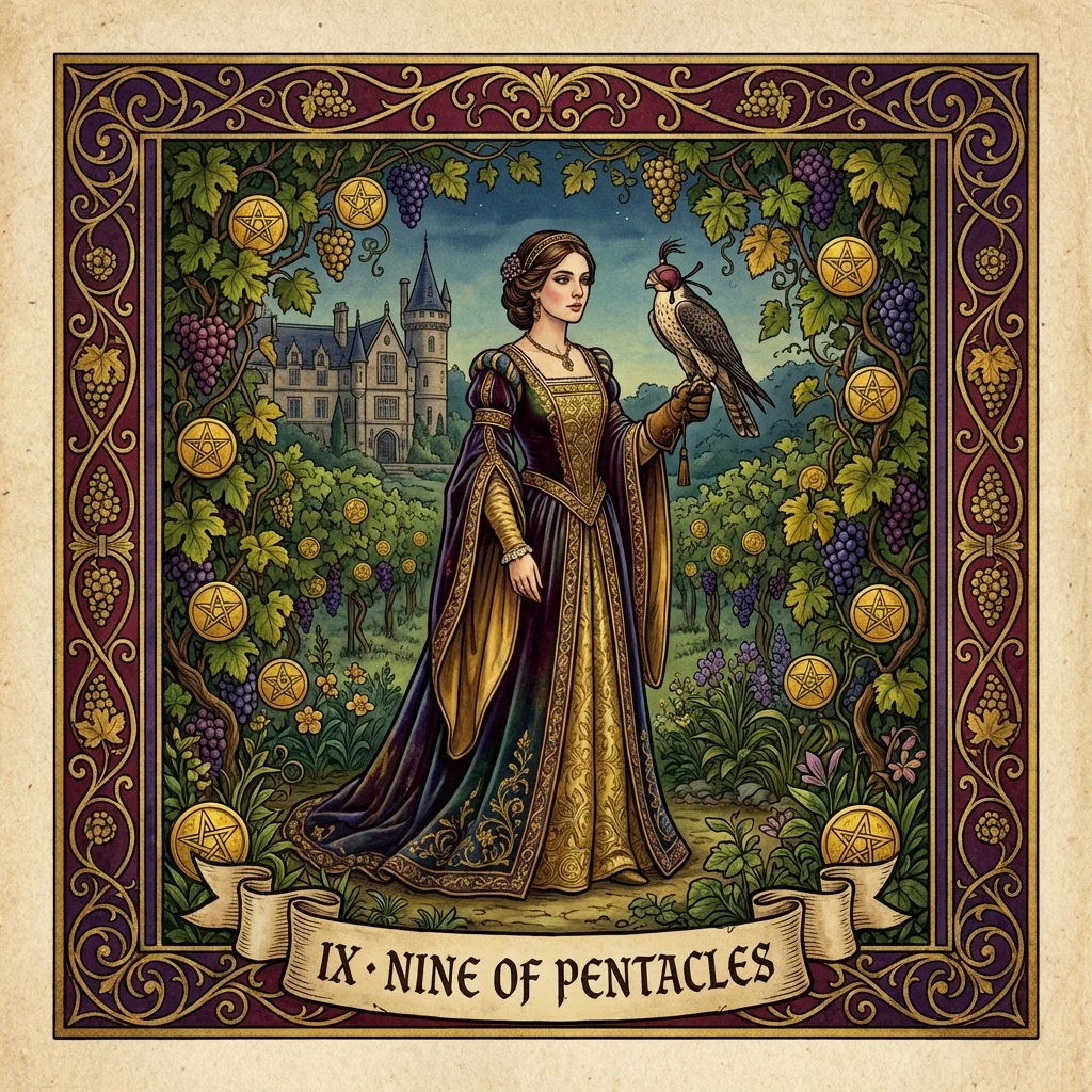 The Nine of Pentacles celebrates the rewards of discipline and hard work — abundance, luxury, and self-sufficiency. You have built a beautiful life through your own efforts.