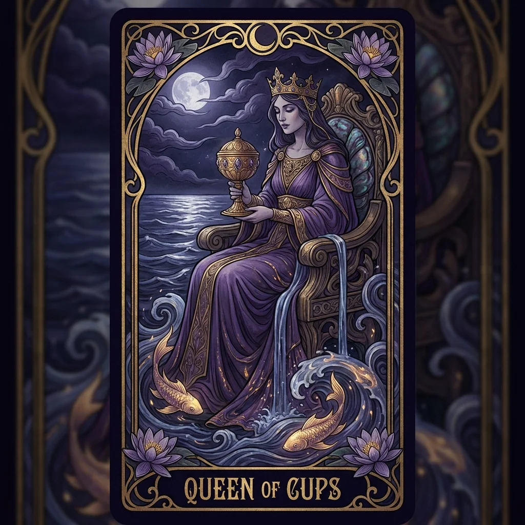 The Queen of Cups embodies deep compassion, emotional intelligence, and powerful intuition. She feels deeply and understands others' emotions. A nurturing, empathic presence.