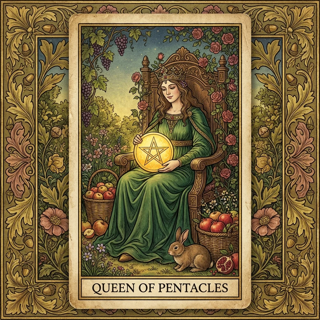 The Queen of Pentacles creates a warm, abundant, and secure environment through practical wisdom and nurturing care. She manages home and resources with grace and generosity.
