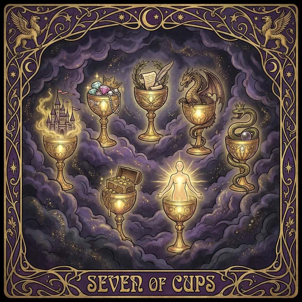 The Seven of Cups presents an overwhelming array of choices, fantasies, and illusions. Not everything is as it seems — you must discern between dreams and reality.