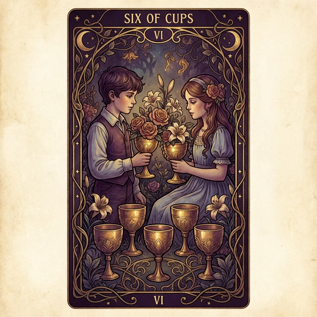 The Six of Cups evokes nostalgia, childhood innocence, and happy memories. A return to simpler times, reconnection with old friends, or the gift of unconditional kindness.