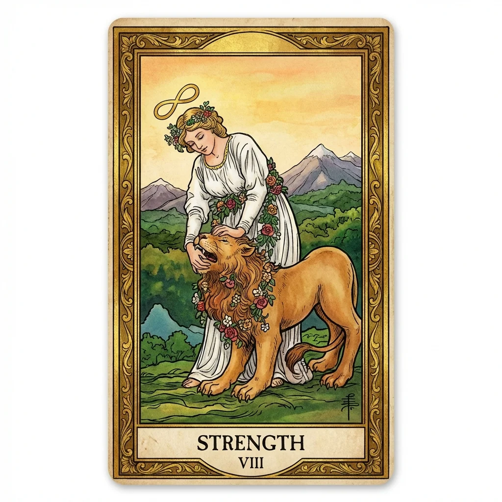 Strength represents inner courage, patience, and compassion. True strength comes not from force, but from gentle mastery of one's instincts and emotions.