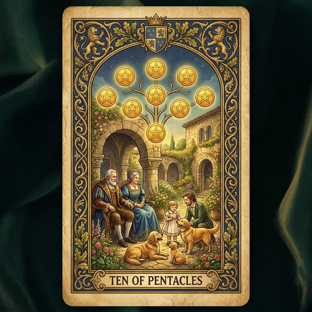 The Ten of Pentacles represents lasting legacy, family wealth, and the culmination of material success across generations. Security, tradition, and the establishment of something enduring.