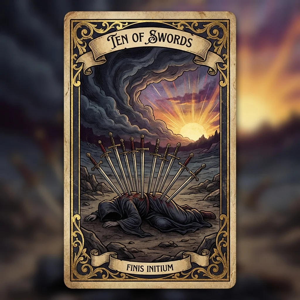 The Ten of Swords marks a painful ending, the absolute bottom. Betrayal, devastating loss, or complete defeat. Yet the sun rises on the horizon — this is the end, but also the beginning of recovery.