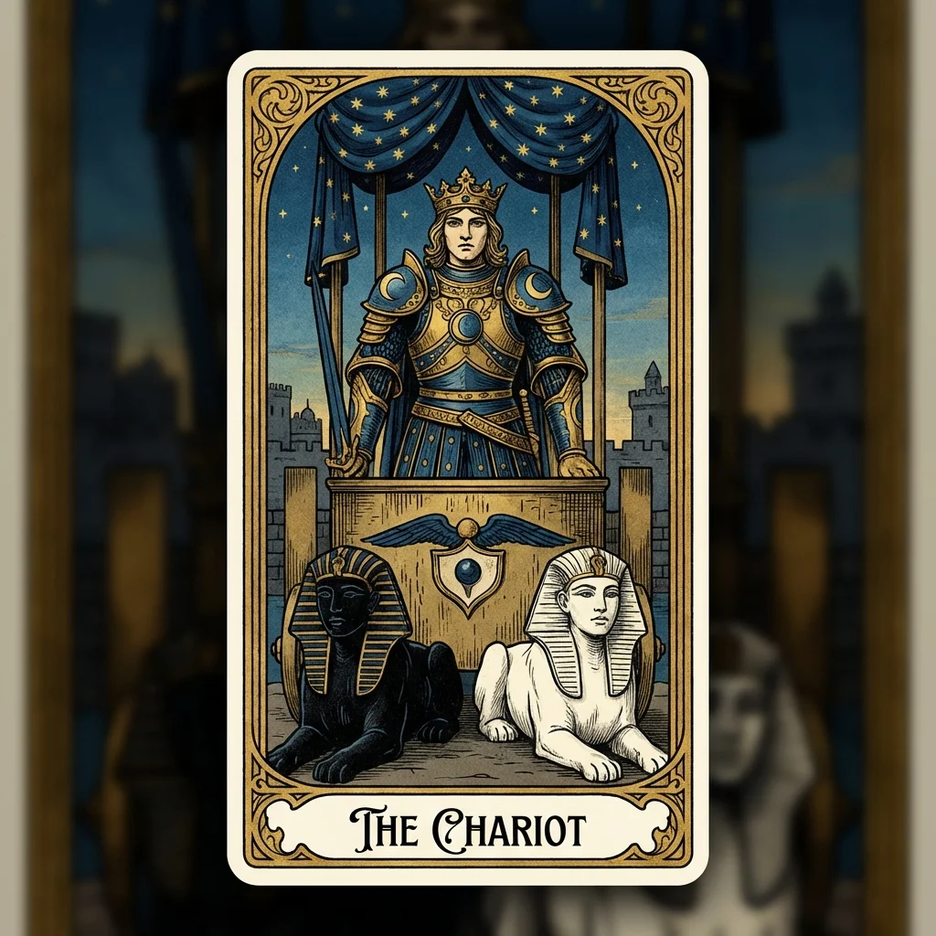 The Chariot represents willpower, determination, and triumph over obstacles. It speaks of maintaining focus and control while moving forward with confidence.