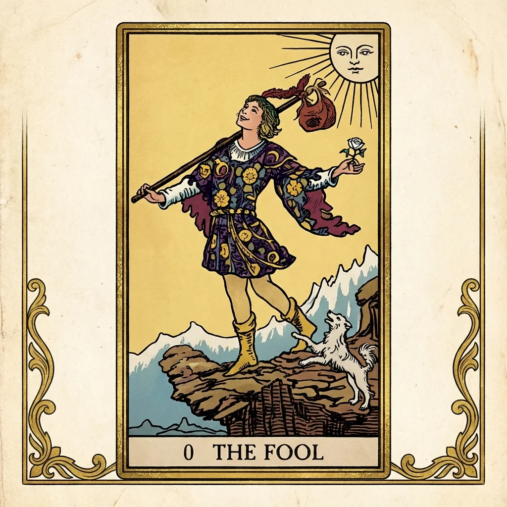 The Fool stands at the edge of a cliff, gazing upward with a white rose in one hand and a small bundle in the other. A small dog leaps at his heels. Numbered 0, The Fool exists outside the sequence — both the beginning and the end of the Major Arcana journey.