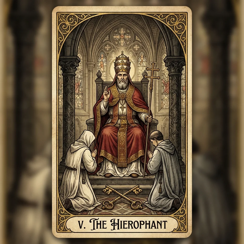 The Hierophant represents spiritual guidance, tradition, and conventional teaching. He embodies institutional knowledge and the path of established wisdom.