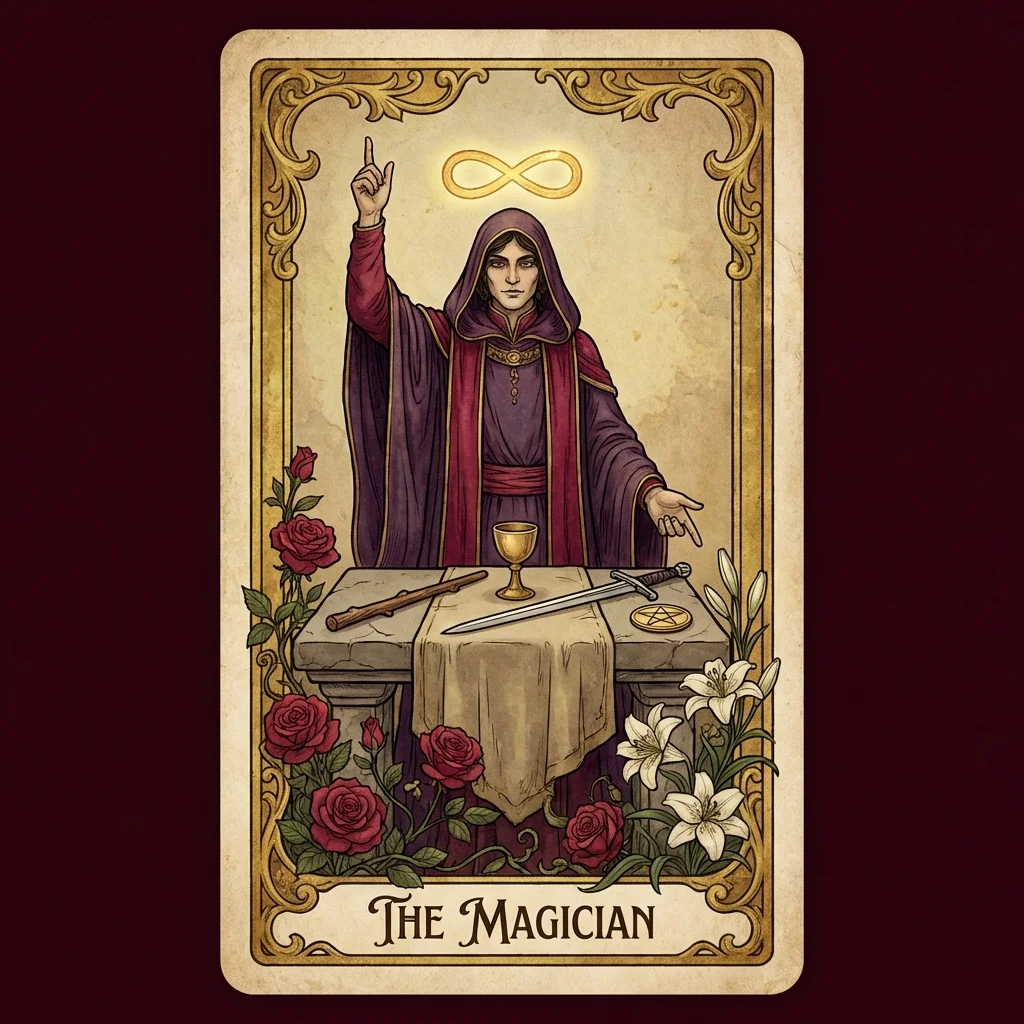 Il Mago sta davanti al suo tavolo con tutti e quattro i simboli dei semi — una coppa, un pentacolo, una spada e un bastone. Una mano punta verso il cielo, l'altra verso la terra, canalizzando l'energia cosmica nella realtà materiale.