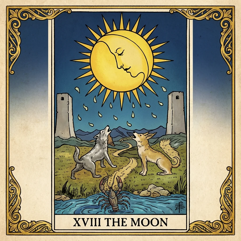 Una luna piena illumina un paesaggio dove un cane e un lupo ululano. Un gambero emerge da uno stagno, e un sentiero serpeggiante conduce tra due torri verso l'ignoto.
