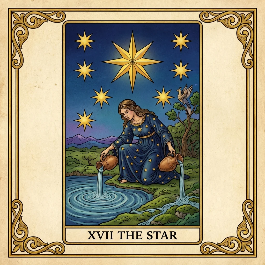 The Star brings hope, renewal, and inspiration after the destruction of The Tower. It represents faith in the future, spiritual connection, and the calm that follows the storm.