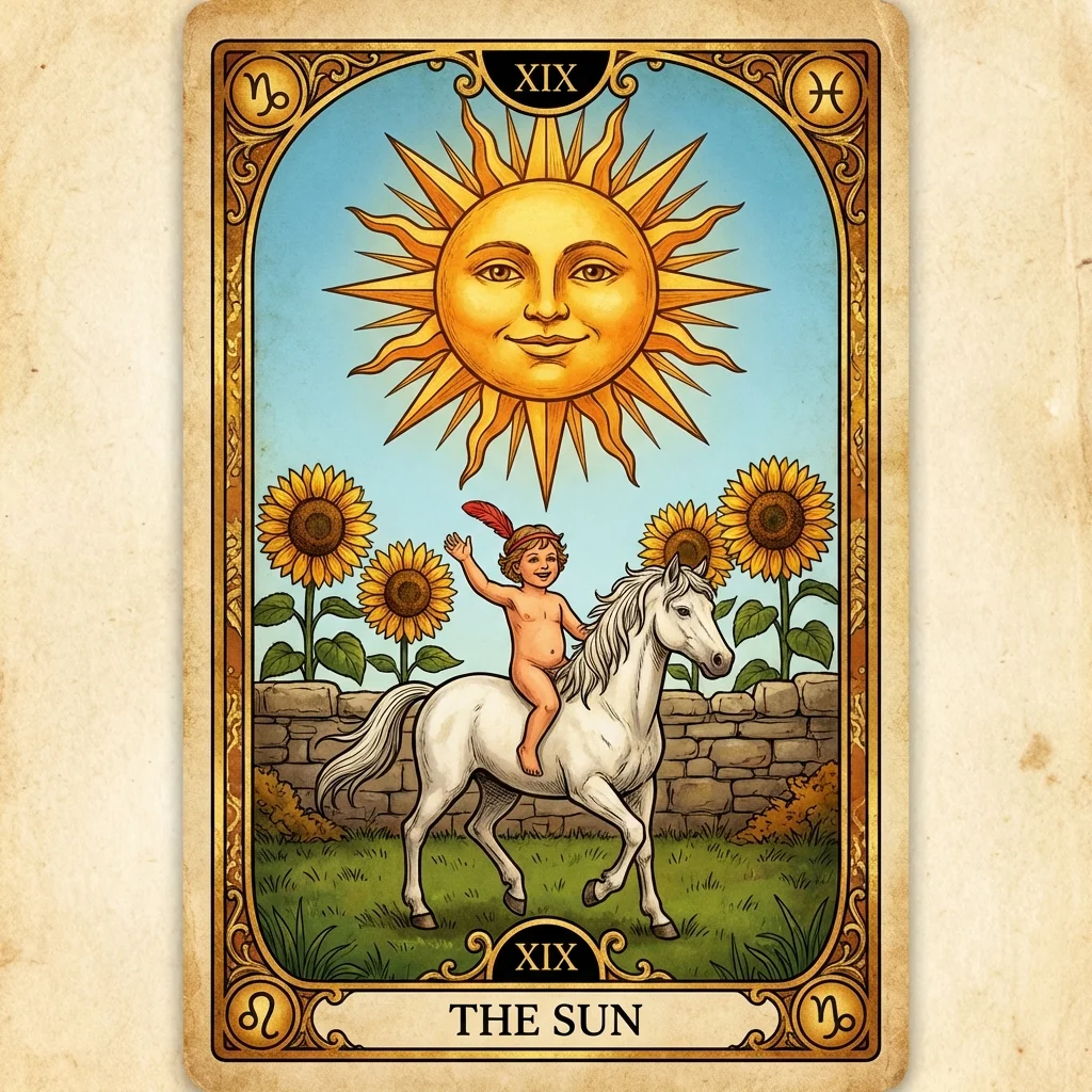 The Sun is one of the most positive cards in the deck. It represents joy, success, vitality, and clear understanding. Everything is illuminated — there is nothing to hide.