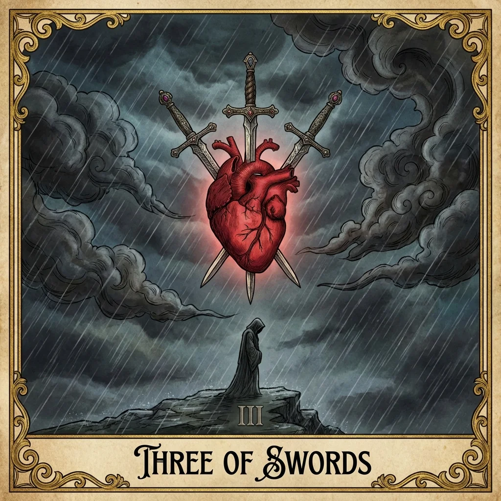 The Three of Swords pierces the heart with painful truth, heartbreak, and grief. A relationship wound, betrayal, or the sorrow that comes from seeing things as they really are.