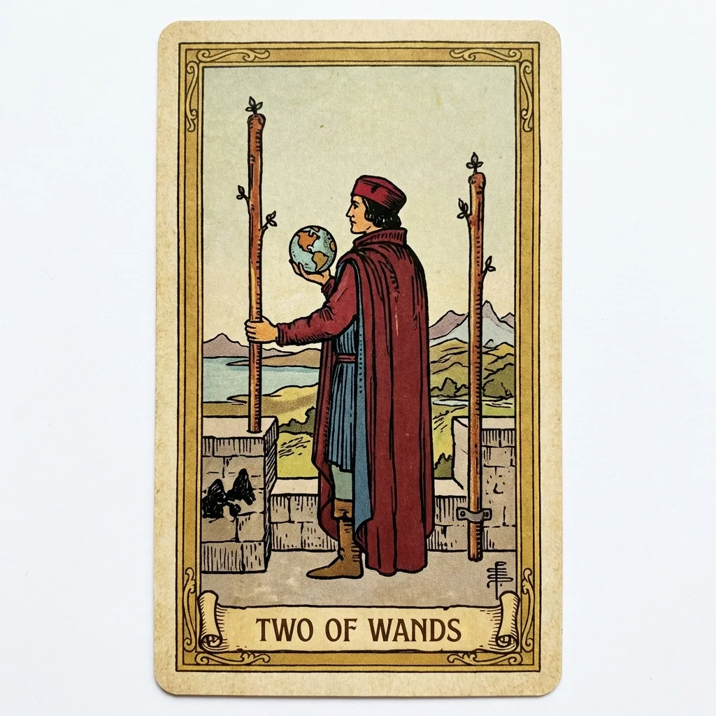 The Two of Wands represents planning, making decisions about the future, and stepping out of your comfort zone. You hold the world in your hands and must choose your path forward.